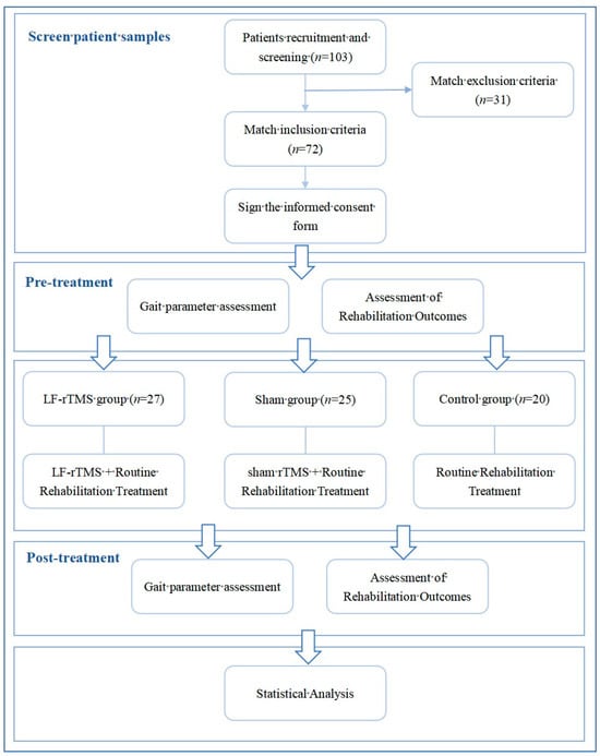 Between January 2022 and October 2023, 72 stroke patients from the Department of Rehabilitation Medicine, the Second Affiliated Hospital of Dalian Medical University, met the inclusion criteria. By envelope drawing, the patients were randomly assigned into three groups: control group (n = 20), sham stimulation group (n = 25), and TMS group (n = 27), totaling 72 cases. The efficacy of interventions before and after treatment was evaluated using a blinded method. Of the enrolled patients, there were 25 males and 47 females, with an average age of (60.91 ± 4.27) years, and the onset of stroke ranged from 14 to 45 days at the time of admission. There were no significant differences in gender, age, disease duration, stroke type, and affected side among the three groups (p > 0.05), as shown in Table 1. Figure 1 presents a flow chart of the trial, delineating the process for screening patient samples, organizing the sequence of stimulation interventions and rehabilitation training, and scheduling the assessments of lower-limb function and gait parameters.