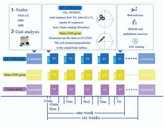 During the intervention, patients assume a seated position and are treated with the CCY-1 magnetic field therapy device (Yiruide, Wuhan, China). A positioning cap is worn, and an “8”-shaped coil is used, with the coil oriented perpendicular to the cranial bone surface, targeting the primary motor cortex M1 area of the healthy side to stimulate the lower-limb motor area. Parameters: frequency of 1 Hz, 90% Resting Motor Threshold (RMT), each sequence lasts 10 s with a 5-s interval, and this is repeated for 60 sequences, totaling 15 min and 600 pulses. This selection is based on an expert consensus that reflects established practices in the field [13]. The intervention is performed for 15 min per session, once a day, and 5 days a week for 6 weeks. Figure 2 illustrates the parameters for the sham-rTMS and LF-rTMS interventions, detailing the frequency, intensity, and specific coil placements used in each modality.