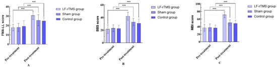 FMA-LE, BBS and MBI were compared among the three groups before and after treatment. (“***” means p < 0.001). (A) FMA-LE; (B) BBS; (C) MBI.