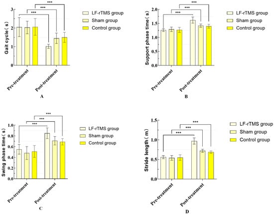 Comparison of the gait cycle, support phase time, swing phase time, and stride length before and after treatment among the three groups of patients. (“***” means p < 0.001). (A) Gait cycle; (B) Support phase time; (C) Swing phase time; (D) Stride length.