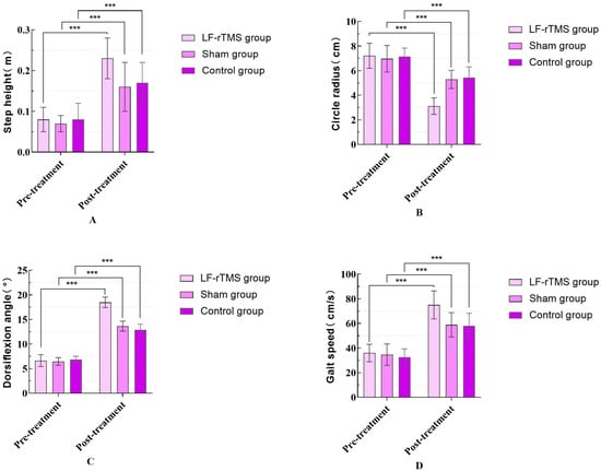 Comparison of the step height, circle radius, dorsiflexion angle, and gait speed before and after treatment among the three groups of patients. (“***” means p < 0.001). (A) Step height; (B) Circle radius; (C) Dorsiflexion angle; (D) Gait speed.