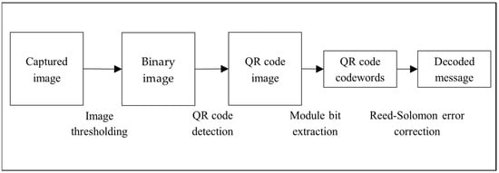 The typical QR code decoding process is illustrated in Figure 2, which consists of the following four steps: (1) image thresholding, (2) QR code detection, (3) module bit extraction, and (4) error correction.