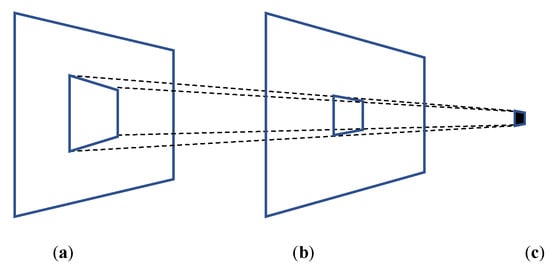 Illustration of pixels of an exhibited module block that are projected onto the centroid pixel of a module block in the captured image. (a) QR code module located at a distance. (b) QR code module located at close range. (c) A pixel in the camera image plane.