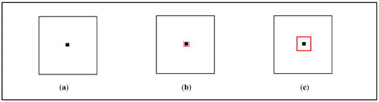 Figure 5 illustrates the working model of the designed two-state module block. Figure 5a is a 1-0 two-state module block. The region of pixels in the exhibited module block to be projected onto the centroid pixel of the module block in the image plane from a close range and from a large distance are marked by the red square in Figure 5b and Figure 5c, respectively. It can easily be evaluated that the average luminance within the red centroid region in Figure 5b is lower than the threshold, while that in Figure 5c is higher than the threshold. Therefore, the module block will be recognized as a 0 module from a close range and as a 1 module from a large distance.