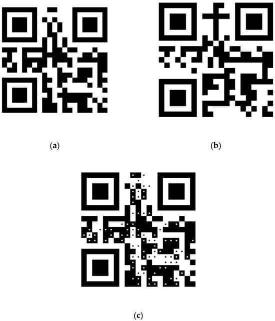 In order for QR code apps to exhibit robustness, some research [,,] has applied image processing algorithms to increase the decoding rate of QR code images with non-uniform backgrounds or viewed in variable lighting conditions. A standard QR code consists of a square grid of black and white square blocks that reveals no useful information to human eyes. Some QR code generation methods [,,,,,,] were proposed for constructing QR codes with visually meaningful patterns in order to provide discriminative information to human beings.
