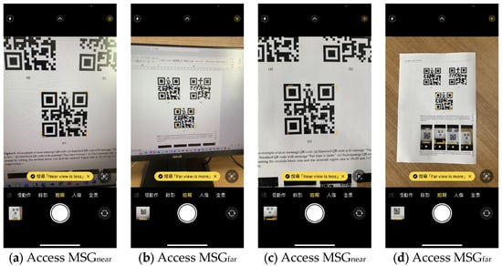 Accessing MSGnear and MSGfar from the dual-message QR code. (a) Snapshot of QRdual displayed on the screen captured from a close range. (b) Snapshot of QRdual displayed on the screen captured at a distance. (c) Snapshot of QRdual displayed on paper captured from a close range. (d) Snapshot of QRdual displayed on paper captured at a distance.