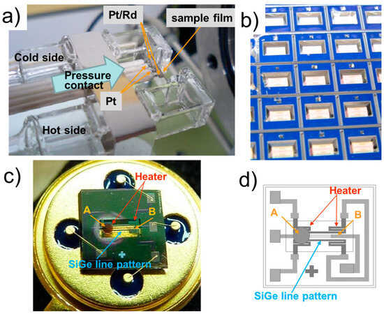 Figure 1a shows the TE measurement electrode system used in this study with the air-flow-cooled electrode, where one side of the sample is cooled down by air flow inside the double quartz tubes to induce a temperature difference in the sample. This system has been redesigned and we modified its electrode probes to have 4-point pressure-contact electrodes. Every electrode is an R-type thermocouple (TC) of platinum–13% rhodium vs. platinum, which is guided and supported by an alumina tube and pressed onto the thin-film sample. Cooling the cold side of the thin-film sample induces a temperature difference, ΔT, and thermoelectric voltage, ΔV, across the film sample. The measurement error was below 5%, which was verified in a previous study with the same SiGe material and B-doped Si [20].