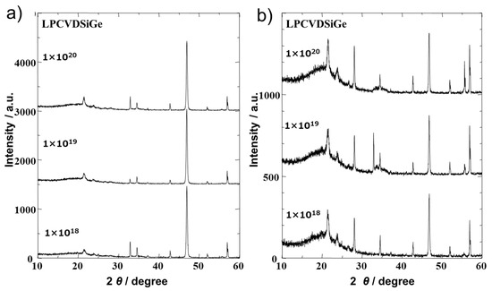 XRD patterns of the boron-doped Si0.8Ge0.2 thin films (a) as deposited via LPCVD and (b) after annealing at 1050 °C for 5 h with a 150 cm3/min Ar gas flow. The figures shows the nominal boron doping level during the CVD process.