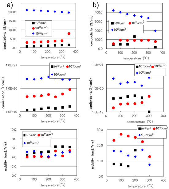 After the thermal annealing, the microstructures of the SiGe films changed as the grains grew, and as a result, the mobility of the thin films increased drastically, as plotted in Figure 3b. The carrier concentrations of the 1019 and 1020 cm−3 films decreased, but that of the 1018 cm−3 film increased during the annealing. The former could be due to the precipitation of the dopant and the latter could be due to thermal activation, which is a common phenomenon in the post-processing of high-doping-level films. As a result, the conductivities of all the samples increased due to the thermal annealing.