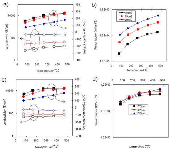 Figure 4a shows the thermoelectric properties of the as-deposited SiGe films. The Seebeck coefficient, α, and the conductivity, σ, were measured from 78 to 470 °C in air. The σ values deviated a little from the data of the Hall measurements, which seems to be due to both the difference in electrode configurations and the uniformity of the boron dopant in the batch of the thin film. The temperature dependencies of σ measured across a wide temperature range indicate clearly that the films with higher dopant concentrations are metallic, and those of lower dopant concentrations are semiconductor-like. The temperature coefficient of resistance, TCR [25], was large for the films of lower dopant concentrations. However, when increasing the dopant, the TCR of the film decreased and the films became metallic.