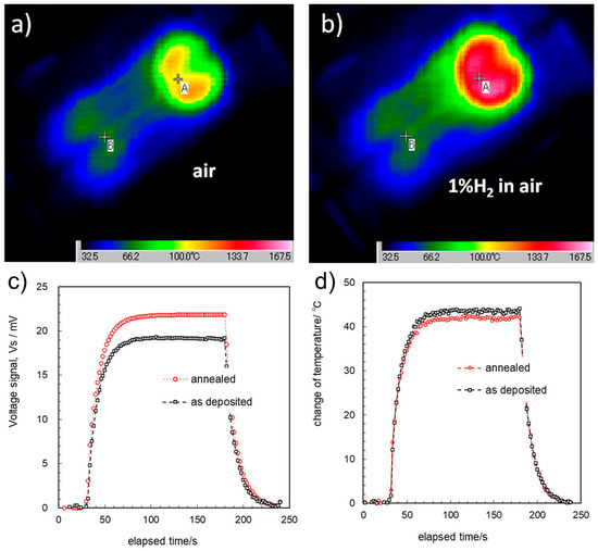 Operando measurements of the gas-sensing performance of THGSs of 1018 cm−3 boron-doped Si0.8Ge0.2 thin films: (a) temperature distribution of the device surface in air flow; (b) in hydrogen 1% air gas flow; (c) transient of voltage signal, Vs; (d) change in temperature between two points of A and B on the device surface for the devices fabricated with the as-deposited SiGe film and annealed SiGe film.