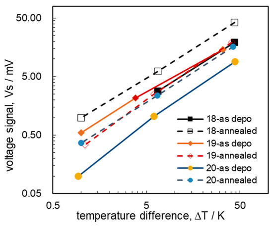 The voltage signals, Vs, of the various THGSs, plotted with respect to the change in the temperature difference between points A and B, ΔT, for different boron doping levels and process conditions.