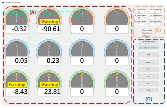 The interface of the self-developed software. Panel (A) displays the real-time pelvic angle in anterior–posterior tilt, right–left tilt, and right-left rotation. Panel (B) sets limitations on pelvic angles during lumbopelvic control movements. Panel (C) buttons for controlling the application.