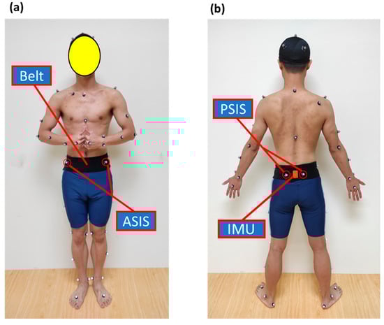 Placement of IMU covering the anterior superior iliac spines (ASIS) and posterior superior iliac spines (PSIS) in the real-time biofeedback system for lumbopelvic control training. (a) Anterior view; (b) posterior view.