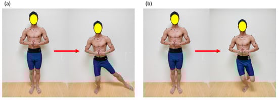 The exercise required participants to perform squats while simultaneously maintaining balance and an upright torso position. Additionally, participants needed to cross their arms over their chest and flex the knee of the non-testing leg to a 90-degree angle, as shown in Figure 4b. The motion limited the extent of anterior–posterior pelvic tilt, requiring participants to maintain an upright posture throughout.