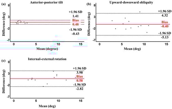 Bland–Altman plot of pelvic angles with 95% limits of agreement (dashed lines) and the mean difference (solid red line) between the real-time biofeedback system and VICON for lateral slide exercise: (a) anterior–posterior tilt; (b) upward–downward obliquity; and (c) internal–external rotation. Difference: real-time biofeedback system − VICON. Mean: (real-time biofeedback system + VICON)/2.