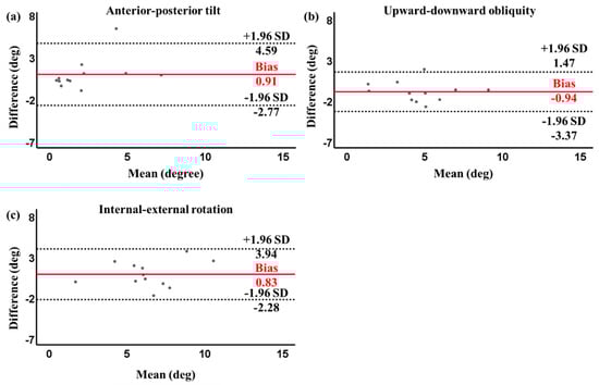 Bland–Altman plot of pelvic angles with 95% limits of agreement (dashed lines) and the mean difference (solid red line) between the real-time biofeedback system and VICON for single-leg squat exercise: (a) anterior–posterior tilt; (b) upward–downward obliquity; and (c) internal–external rotation. Difference: real-time biofeedback system − VICON. Mean: (real-time biofeedback system + VICON)/2.
