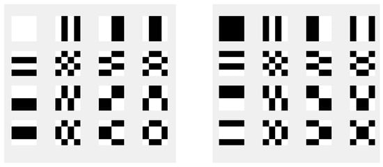A Hadamard matrix has thirty-two of these basis images. Figure 2 shows them all, as determined using Equation (18). It consists of two sets of sixteen basis images of Hadamard matrices, which are inverted versions of each other.
