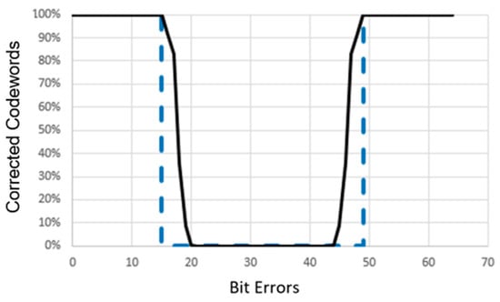 A simulation is conducted to evaluate the error correction capabilities of the improved and standard Hadamard Error-Correcting Codes using codewords of length n = 64. Figure 7 illustrates the results. The x-axis represents the amount of bit mistakes, while the y-axis represents the proportion of repaired codewords. The improved 2D Hadamard Code is shown with a solid line, whereas the conventional 2D Hadamard Code is represented with a dashed line. The standard Hadamard Error-Correcting Code, as explained in Section 2.1, possesses the following characteristics: If the number of mistake bits falls between the range of [1, n/4 − 1] to [3n/4 + 1, n], this system is capable of completely correcting all erroneous codewords of length n, achieving a 100% success rate. If n = 64, the conventional Hadamard Code is capable of correcting mistakes when their quantity falls between the ranges of 1 to 15 and 49 to 64. With the Enhanced Hadamard Correcting Code, errors that exceed these limitations can be fixed. In the instance of 16 mistakes, 92% of all potential error patterns inside the codeword can be corrected. Even with 17 faults, there is still a possibility to rectify 83% of all error patterns. In the case of the Standard Hadamard Code, no mistakes can be rectified when there are 48 errors. However, the Enhanced Hadamard Code is capable of correcting faults in this scenario. It has the ability to rectify 92% of mistake patterns.