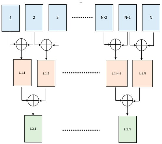 The method employed for delivering a low-pass filtered video involved the utilization of a multi-level interframe discrete wavelet transform (DWT) with the Haar wavelet. Figure 12 depicts the operational principle of this transformation. During the initial stage, the two successive frames are combined by calculating their average. In the second level, the frames from the first level are averaged, and this process continues for subsequent levels. In this particular watermarking system, discrete wavelet transform (DWT) levels ranging from 12 to 16 are employed.