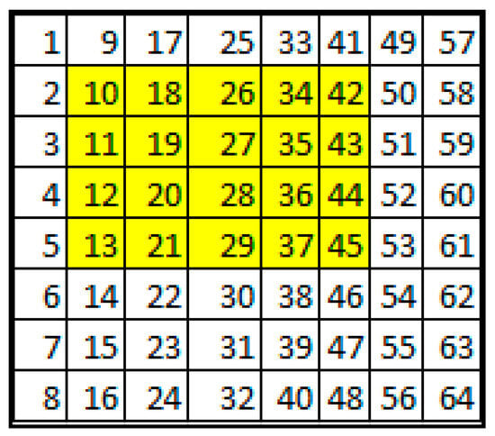In order to carry out the embedding process, certain coefficients from the discrete cosine transform (DCT) spectrum of the discrete wavelet transform (DWT)-filtered video sequence need to be chosen. Figure 13 displays the coefficients that meet the criteria for watermarking. Most of these items originate from the yellow region.