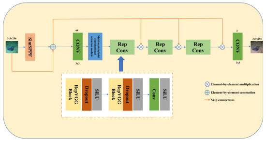 Figure 1 shows the schematic architecture of the proposed Rep-UWnet model. The original image for the input of the model in this paper is a 256 × 256 RGB underwater low-quality image. First, after being extracted by the SimSPPF module and added with the original image features to obtain the image multi-scale information and enhance the perceptual field, the features are then used as the input image. Second, the input image is connected to the output of each RepConv block through a Skip connection. The input image goes through the first convolutional layer with a kernel size of 3 × 3 to generate 64 feature maps, and then the multi-scale hybrid convolutional attention module is used to enhance the useful features by reweighting the features of different channels. Third, three RepConv blocks are linked to reduce the number of parameters while extracting features, so as to increase the test speed. Finally, a convolutional layer with 3 kernels generates the enhanced underwater image.