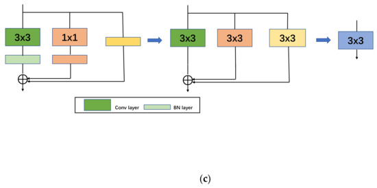 RepVGG Block structure, (a) down sampling; (b) normal; (c) structural re-parameterization process diagram.