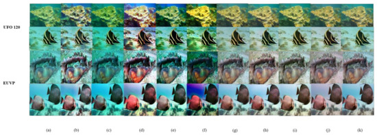 Subjective comparison of Rep-UWnet with existing methods and SOTA models for underwater image enhancement performance on EUVP and UFO 120 datasets. (a) input; (b) CLAHE [11]; (c) DCP [13]; (d) HE [6]; (e) ILBA [7]; (f) UDCP [6]; (g) Deep SESR [16]; (h) FUnIE-GAN [26]; (i) U-GAN [14]; (j) ours; (k) label.