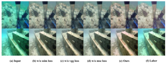 Ablation experiments on the EUVP dataset. “w/o” indicates that the removal of the corresponding loss term in the experiment. (a) Original underwater image (b) with SSIM loss removed, (c) with VGG loss removed, (d) with MSE loss removed, (e) image generated by the proposed methods, and (f) reference image.