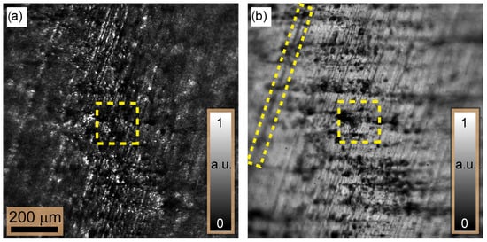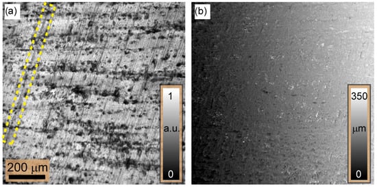 - : Here, we have managed to reduce the FWHM from m to m, achieving a one-fourth reduction. However, there is a significant decrease in speckle contrast; i.e., the speckle contrast in the image plane disappears due to the incoherent superposition of multiple independent uncorrelated speckle fields. This has a significant impact on the accuracy and reliability of the reconstruction of the 3D height map, which is based on the evaluation of the contrast. In addition, it deprives the ExASPICE profilometry of its advantage of encoding depth information as a function of speckle contrast compared to the focus variation method, which uses surface features such as scratches or dents. Thus, the Michelson contrast (MK) measure cannot be used. However, the fast and non-mechanical depth scanning method distinguishes ExASPICE from the focus variation technique. Experimentally, the 3D shape of the tilted plate from ring illumination measurements, employing the Gaussian derivative (GDER) focus measure in analogy to the focus variation method, was used for reconstruction. The resulting 3D depth map, Figure 7a, displays a height of m, differing from the calculated geometrical value by only m. However, the surface map shown in Figure 7b and reconstructed from a single LED source, where , reveals additional fine details about the depth of the surface scratches.