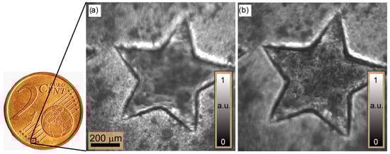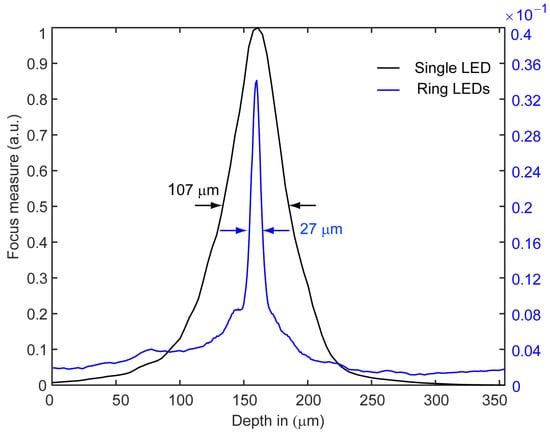 - : Here, we achieve a reduction in the FWHM from m to m, i.e., a factor of eight. We have demonstrated that the redesign of the illumination with the use of a few LEDs has the potential to improve the Michelson contrast evaluation. According to Equation (7), the contrast envelope reaches the minimum value defined by . In this configuration, the speckles generated across the focus plane have maximum contrast while the contrast vanishes across out-of-focus planes. In contrast to the focus variation method, no surface features or textures are required to reconstruct the 3D depth map. The 3D profile of a part from the 2 cent (EUR) coin based on the speckle contrast serves as an example. Here, five sets of intensity measurements are taken with the newly configured illumination. An analysis of the local surface variations yields ±2 m (), which is close to the known production-related surface variations of the coin. The results demonstrate a twofold improvement in measurement accuracy for ExASPICE compared to SPICE profilometry. Thus, ExASPICE profiling has the potential to enhance the lateral and axial resolution of the measurement.