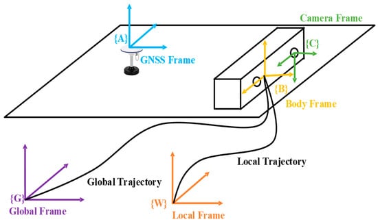 This section begins with the definitions of the coordinate systems. The involved coordinates in this paper are shown in Figure 2, including the sensor frames: the camera frame {C}, the IMU frame {B} (vehicle frame), and the GNSS frame {A}. The phase center of the GNSS antenna serves as the coordinate origin for {A}. {W} is the reference frame for local odometry, aligning the gravity vector with the z-axis, and the origin is set at the vehicle’s starting point, . {G} represents the global East-North-Up (ENU) frame, serving as the reference frame for global poses, with an origin identical to the local reference frame {W}. The following symbols will be used. We define and to represent matrices (or vectors) in {G} and {W}, respectively. , , and are the camera, IMU, and GNSS data frames when capturing the kth image. is considered the rotation matrix from frame {A} to {B}, with the corresponding Hamilton quaternion form denoted as . and represent the position and velocity vectors of {A} in {B}, and is the homogeneous expression of the transformation matrix from {A} to {B}. External parameters between sensors are employed to transform measurement data from different frames to a unified coordinate system. The external parameters for Camera-IMU include and . represents the GNSS-IMU external parameter, known as the lever arm, and all involved external parameters are calibrated offline. denotes vector cross-product, denotes quaternion multiplication, and finally, is used to represent measurement data containing noise.