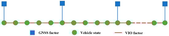 The global pose estimation problem can be represented using the pose graph in Figure 3. Each VIO node represents the estimated local six-degree-of-freedom pose. Given the high accuracy of visual–inertial odometry in the short term, we introduce the relative pose between these two nodes as a constraint to the pose graph. In instances where a node is associated with GNSS measurements, GNSS constraints are also included as global constraints in the pose graph. This approach proves effective in mitigating the impact of cumulative errors, considering the non-accumulative nature of GNSS measurements.