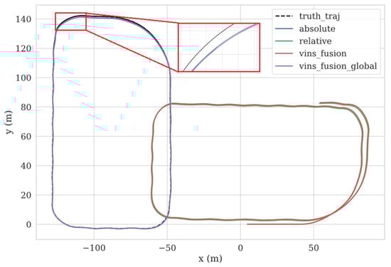 The trajectories in Carla. Truth_traj represents the ground truth trajectory, absolute is the trajectory obtained from the proposed adaptive algorithm, and relative is the trajectory obtained from the proposed two-stage initialization process. Vins_fusion is the trajectory obtained from VINS-FUSION (without GNSS). Vins_fusion_global is the trajectory obtained from VINS-FUSION (with GNSS).