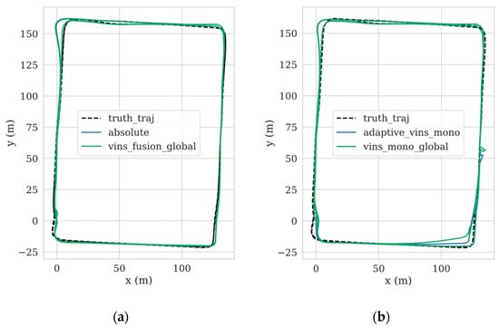 The trajectories in the UrbanNav-HK-Data20190314. (a) shows the result trajectories obtained from our proposed algorithm compared to VINS-FUSION (with GNSS), absolute is the trajectory obtained from the proposed adaptive algorithm, and vins_fusion_global is the trajectory obtained from the VINS-FUSION; (b) shows the result trajectories obtained when our method and VINS-FUSION were extended to VINS-MONO. adaptive_vins_mono is the trajectory obtained from the proposed adaptive algorithm, and vins_mono_global is the trajectory obtained from VINS-FUSION. The red box indicates visual–inertial odometry (VIO) failure.