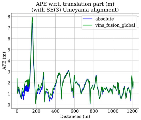 The efficacy of our adaptive algorithm was verified on the complex UrbanNav-HK-Data20190314 dataset, known for its dynamic obstacles in urban alleyways. A comparative analysis was performed against the advanced visual–inertial navigation system VINS-FUSION (with GNSS) to evaluate the algorithm’s performance. Additionally, to broaden the scope of our method, we extended the comparison to VINS-MONO. The trajectory outcomes are illustrated in Figure 5. In order to assess the overall accuracy of the localization trajectory, we present a comparison of the absolute pose error (APE) with VINS-FUSION in Figure 6.