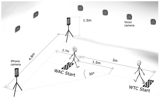 The schema of the motion capture setup. A markerless system used two iPhone cameras placed at a distance of 4.8 m from each other at an angle of 30 degrees to the center of the walking area, which was 3 m long. The marker-based setup employed 17 Vicon cameras surrounding the central walkway. One side marks the beginning of the walk toward the iPhone cameras (WTC Start), while the opposite side signifies the start of walking away from them (WAC Start).