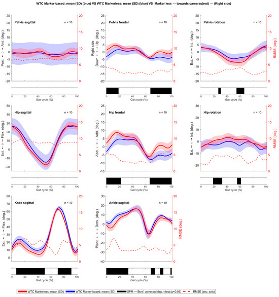 Kinematic comparison between the WTC (red) and WAC (blue) in the right leg in the marker-based system. Root mean square error (RMSE) is shown as a red dotted line, and statistically significant differences, indicated by black bars beneath the respective kinematic signals, were determined by statistical parametric mapping (SPM1d) analysis at a significance level of α = 0.05.