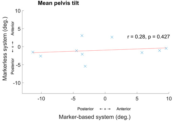 In our comparative analysis of pelvis tracking data between marker-based and markerless systems, notable differences emerged in the standard deviations (SD) of the measurements. Specifically, the captured mean pelvic tilt in Table 1 displayed a larger standard deviation (7.2°) in the marker-based system, signifying a wider variability in pelvic movement. In contrast, data obtained from the markerless system demonstrated a smaller standard deviation in the mean pelvic tilt (2.4°), indicating more consistent pelvis movement data with less variability. While we saw a wider range of pelvis tilt captured by the marker-based system (Figure 3), we did not observe the expected correlated values in the markerless system (the same was true for the left side). We explored these findings through two case presentations.