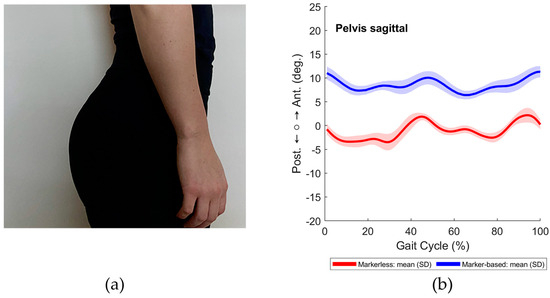 (a) Sagittal view of the pelvis. (b) The movement of pelvic tilt during the right gait cycle: marker-based (blue line) compared to markerless (red line).