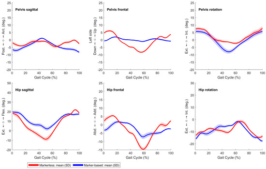 Pelvic and hip movement (left side) of marker-based (blue line) and markerless (red line) systems.
