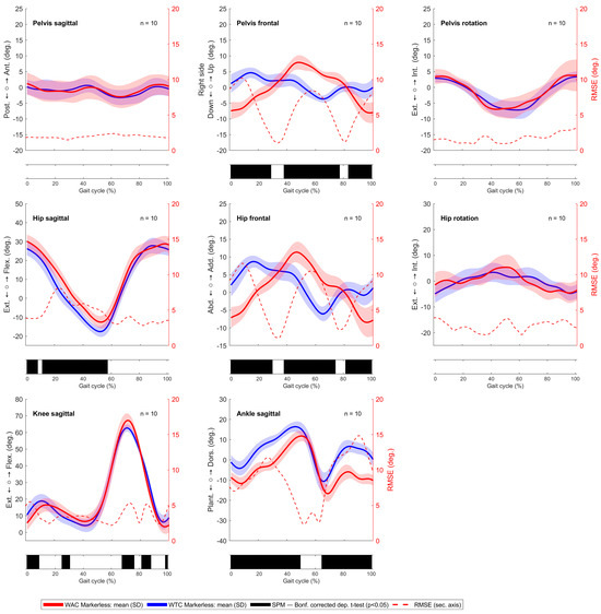 Kinematic comparison of the right gait cycle between the WTC (blue line) and WAC (red line) using the markerless system. Root mean square error (RMSE) is shown as a red dotted line, and statistically significant differences, indicated by black bars beneath the respective kinematic signals, were determined by statistical parametric mapping (SPM1d) analysis at a significance level of α = 0.05.