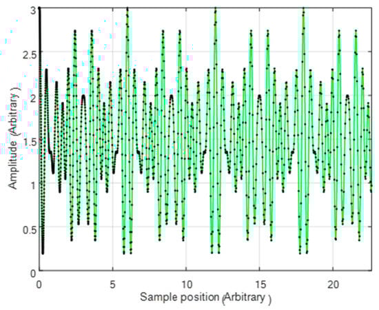 Figure 8 shows the interferogram after scaling, linearizing, and interpolating, where the black dots are the sample points of the original signal.