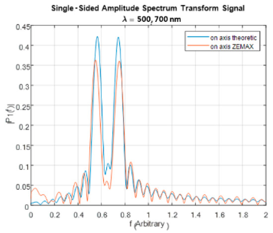 The first step was to compare the interferogram obtained by the ZEMAX simulations and the expected interferogram according to Equations (2) and (3).