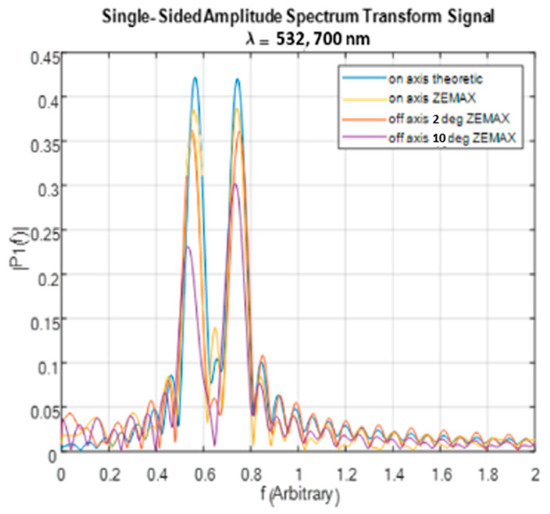 Using the ZEMAX, the interferogram of two wavelengths and with a Calcite waveplate and a thickness of 10 mm was created. The point light source was placed in the center of the FOV and was translated along a line from the optical axis up to the height of 2.2 mm from the optical axis, which is equivalent to the maximum FOV angle (half field) of . The signal obtained for the two wavelengths and the interferogram (their sum) as a function of the angle of incidence are shown in Figure 10. As shown, there was a decrease in the intensities of the interferograms at higher angles due to the “cosine fourth law” reflection on the waveplate aberrations.