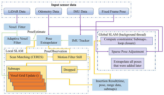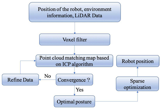The ICP-based optimization algorithm is a method that applies voxel filters in the point cloud library (PCL) to reduce the noise in the point cloud [29]. The ICP algorithm matches the scan to the submap for point cloud registration, and convergence is checked to determine if the algorithm has converged to the best matching pose. If convergence is achieved, the robot’s position is updated, and the process is repeated. Otherwise, further iteration or data optimization may be necessary before repeating the process. This iterative process determines the optimal pose, and the obtained optimal pose undergoes sparse matrix pose optimization to finalize the robot’s position information. The robot’s localization framework is illustrated in Figure 2.