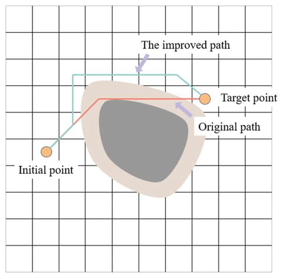 In this improvement, a critical coefficient is introduced to adjust the distance between path points and obstacles in path planning, as shown in Figure 4. This can be used to enhance the safety and efficiency of path planning. By controlling the minimum safe distance between path points and obstacles in the path planning algorithm, it can be adjusted based on specific applications and requirements to ensure that the generated path approaches the target point as closely as possible without colliding with obstacles. This can be represented mathematically as: