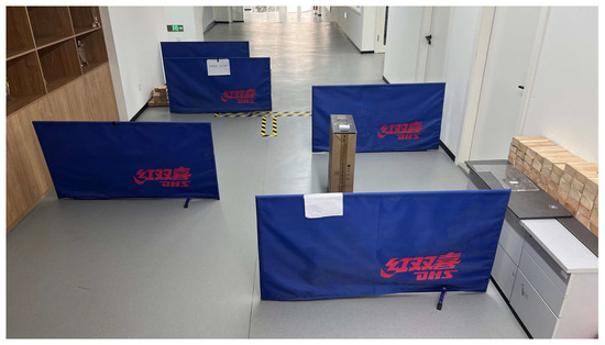 The simulated inspection environment is depicted in Figure 5. It measured 7 m in length and 3.5 m in width. The environment primarily consisted of narrow spaces in which the robot was expected to navigate around and into confined areas, as well as perform obstacle avoidance tasks. This environment could be used to conduct a diverse array of tests, such as evaluating emergency obstacle avoidance capabilities and assessing the smoothness of the robot’s velocity. The obstacles in the environment included 0.5 m × 0.8 m frames and cardboard boxes.