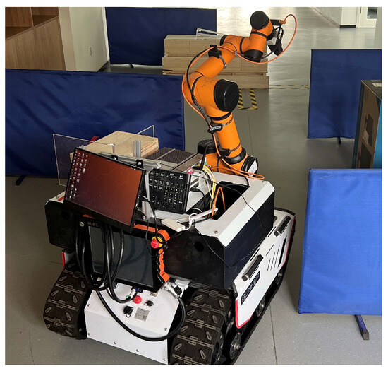 The experimental platform used a tracked differential composite robot, which is shown in Figure 6. The main control board uses an industrial computer (i7 16G 256SSD) as the controller, the LiDAR is VLP 16, and the system adopts the Ubuntu18.04 platform and integrates the ROS system. In the actual experiments, remote control was realized through the ROS distributed framework on the same LAN, which provided a stable operation environment and software support for the robot application. The main parameters of robot movement are shown in Table 1.