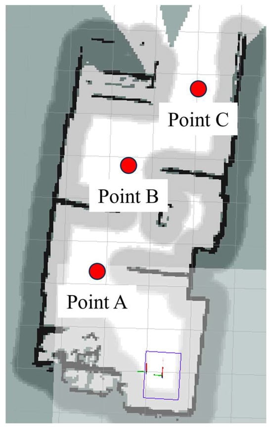 Based on the constructed map, three inspection points, A, B, and C, required by the robot are marked as shown in the Figure 8.